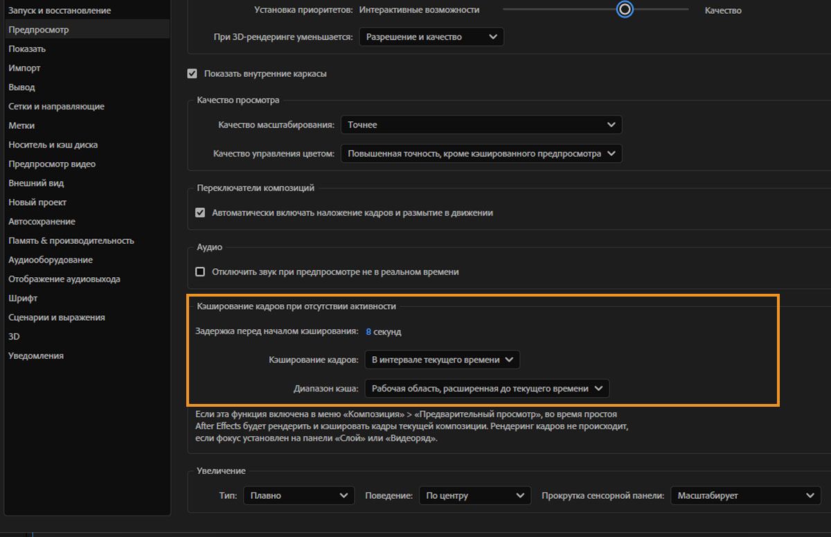 • Atraso de ociosidade antes do início do armazenamento em cache - a duração da ociosidade do After Effects antes que o armazenamento em cache de quadros seja iniciado automaticamente. O padrão está definido para 8 segundos.