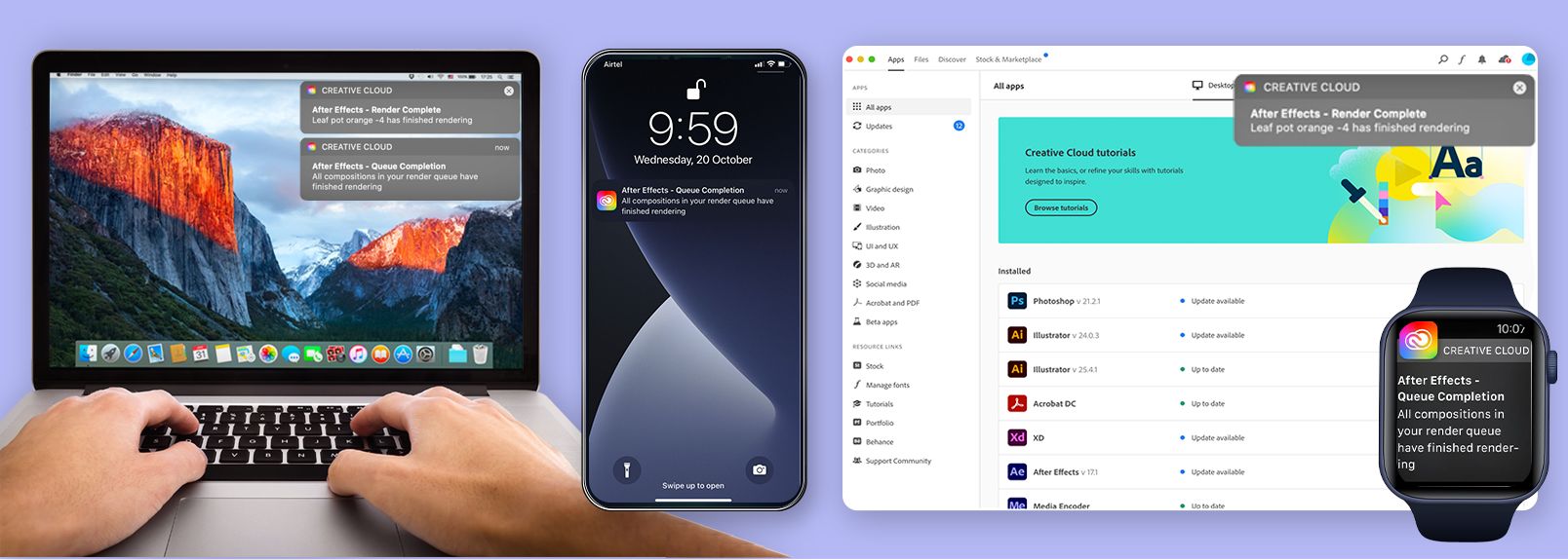 Ao renderizar um trabalho na fila ou concluir a fila inteira de renderização, o After Effects envia uma notificação por meio do aplicativo para desktop e dispositivos móveis da Creative Cloud. Você deve instalar o aplicativo da Creative Cloud no seu dispositivo móvel para receber a notificação. Ao clicar na notificação, ela abrirá a lista de notificações no aplicativo para leitura. Além disso, se você tiver um smartwatch conectado ao seu dispositivo móvel, também receberá a notificação nele.