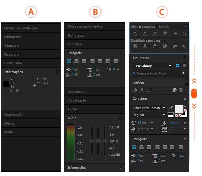 Você pode usar os grupos de painéis empilhados para exibir e ocultar os painéis que normalmente aparecem do lado direito do espaço de trabalho no After Effects.