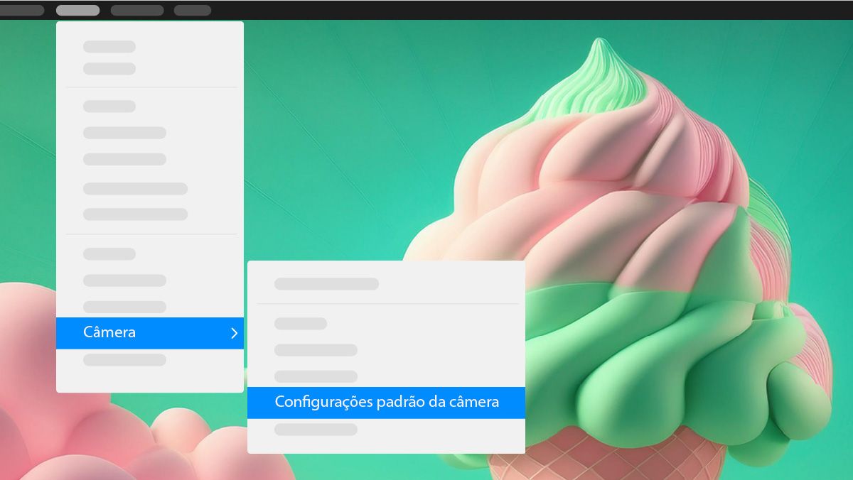 Use o menu Visualizar para ajustar a visualização personalizada e as Configurações padrão da câmera, esteja você visualizando por meio de uma camada de câmera, da câmera ativa padrão ou de uma visualização personalizada.