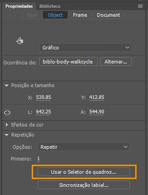 Selecione um símbolo gráfico e acesse Painel Propriedades > Looping > Usar Seletor de quadros. botão para exibir o painel Seletor de Quadros ou selecione Janela >Seletor de Quadros.