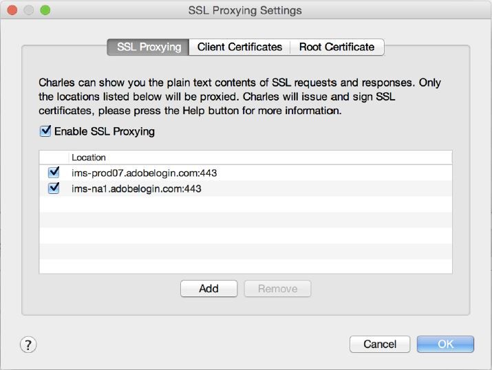 Os registros do aplicativo analisador de pacotes Charles Web Debugging Proxy permitem depurar problemas de identidade nos aplicativos para dispositivos móveis da Adobe Creative Cloud.