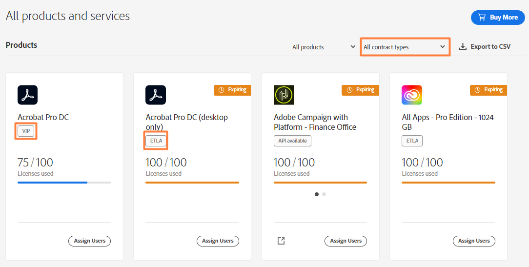 Os administradores do sistema podem gerenciar todos os contratos na guia Conta no Admin Console, enquanto os administradores de contratos podem visualizar apenas os contratos atribuídos a eles. Quando há vários contratos, o nome do contrato aparece ao lado de cada produto no Admin Console para diferenciar os produtos entre os contratos. Saiba mais sobre como gerenciar seus contratos.
