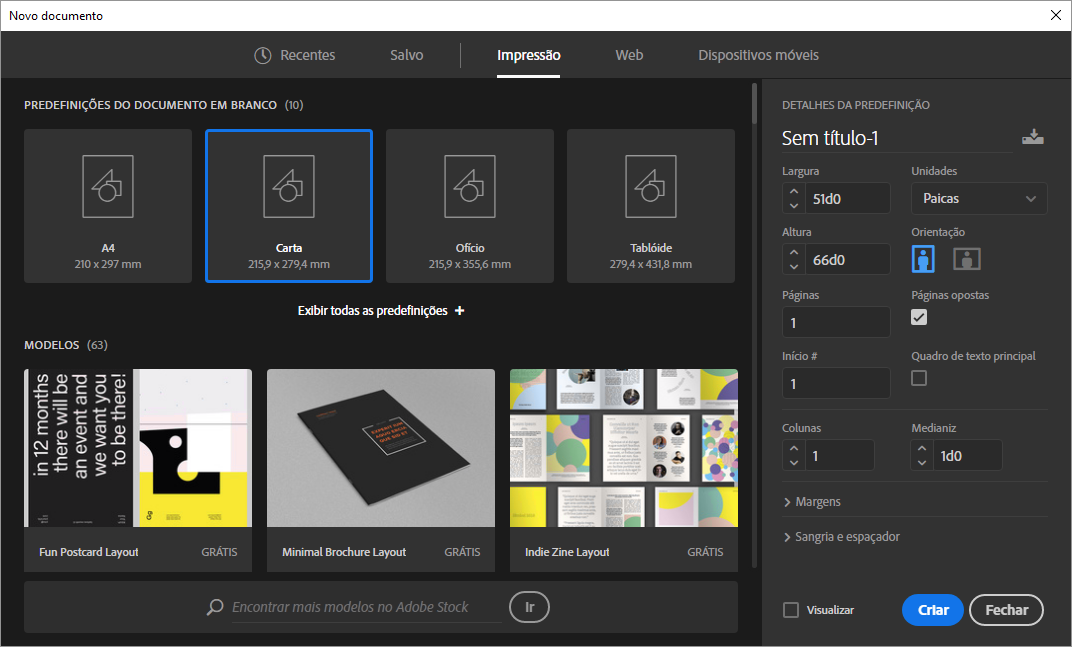 Além dos modelos, também é possível criar um documento selecionando uma das várias predefinições disponíveis no InDesign.