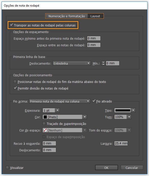 A opção para expandir notas de rodapé pelas colunas é ativada por padrão para todos os novos documentos criados na InDesign CC 2017. No entanto, a opção fica desativada por padrão nos documentos existentes criados em versões anteriores.