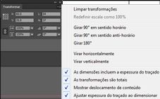 O painel Transformar contém várias opções que determinam o modo como os objetos são transformados e como essas transformações são exibidas no painel Transformar e no painel de controle.