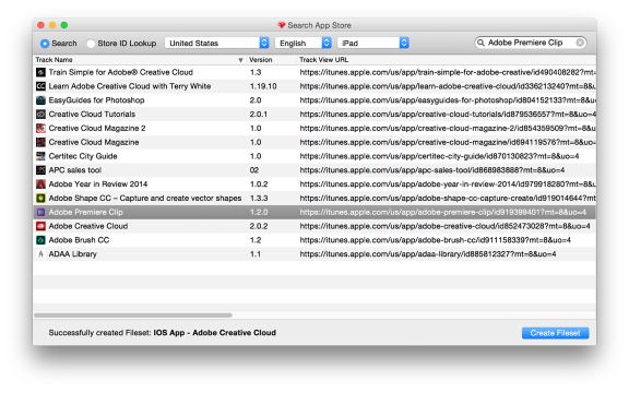 Pesquise pelo aplicativo (tal como o Adobe Premiere Clip), selecione o nome do aplicativo e, a seguir, clique em Criar conjunto de arquivos.