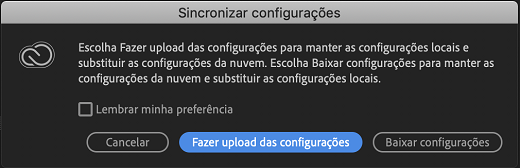 - O Sincronizar configurações não está mais disponível no Premiere Pro CC 2015 (9.0.2) ou anterior. Para usar o Sincronizar configurações, atualize para a versão mais recente.