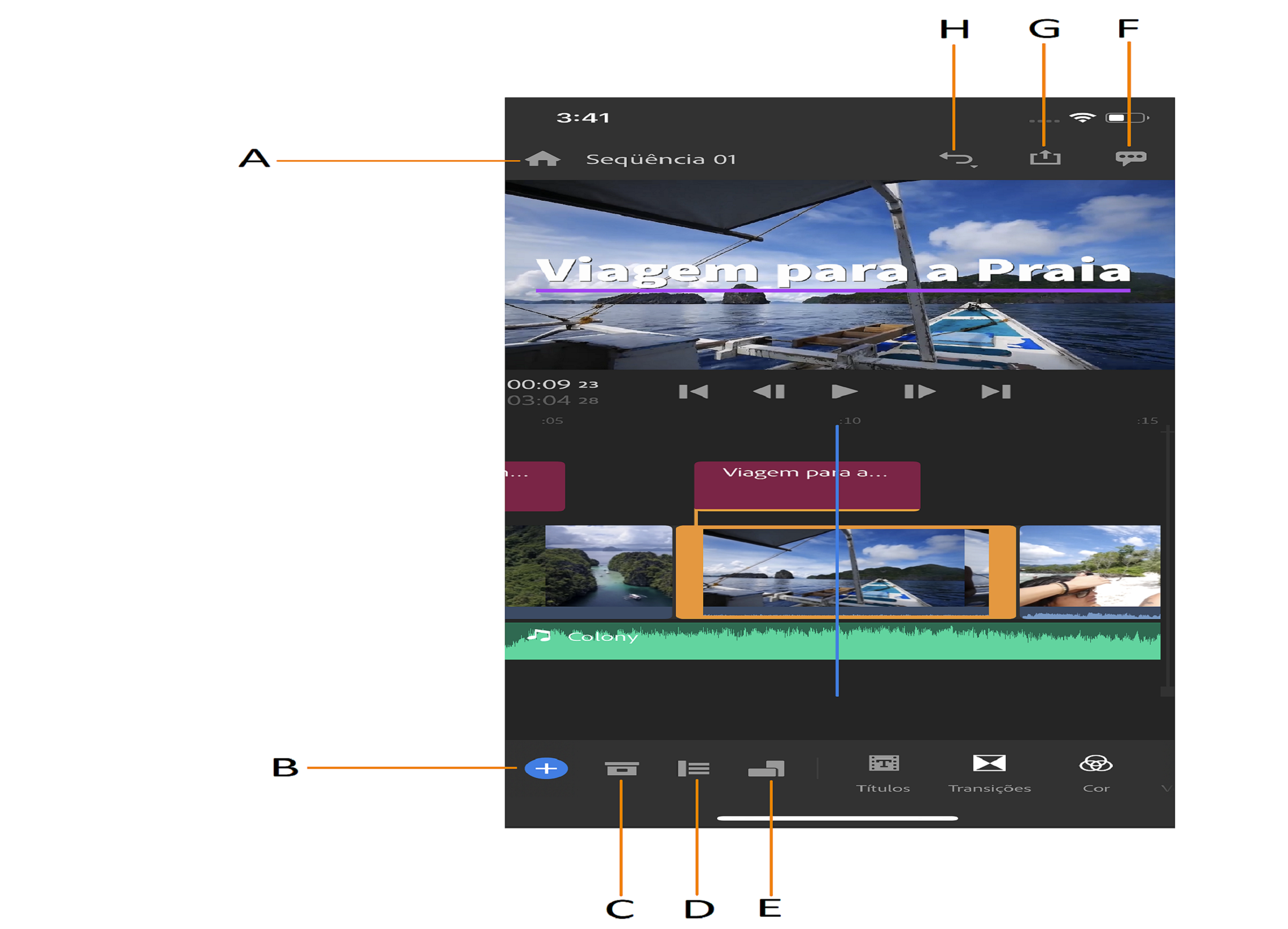 A. Início B. Adicionar mídia C. Ativos do projeto D. Controles de faixa E. Orientação F. Comentários G. Exportar H. Desfazer