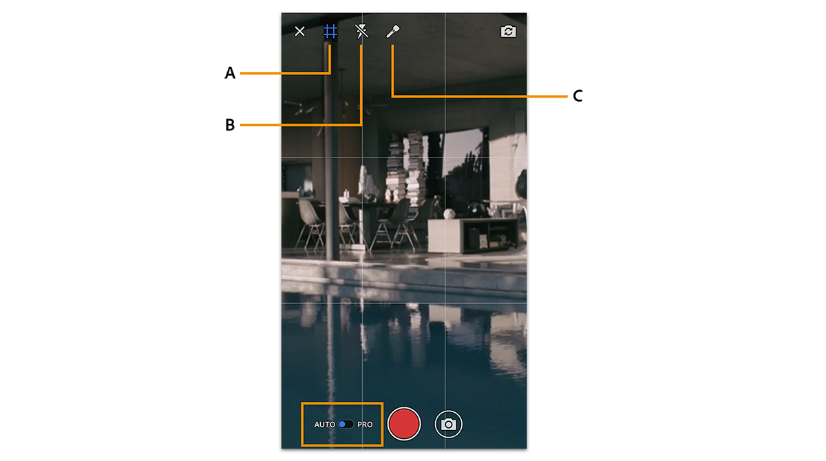 É possível usar o modo automático padrão para controles de captura básicos ou ativar o modo PRO para obter mais configurações, como velocidade do obturador, equilíbrio de branco, resolução, taxa de quadros e ISO. Para obter mais informações sobre as configurações da câmera, consulte Opções de captura.