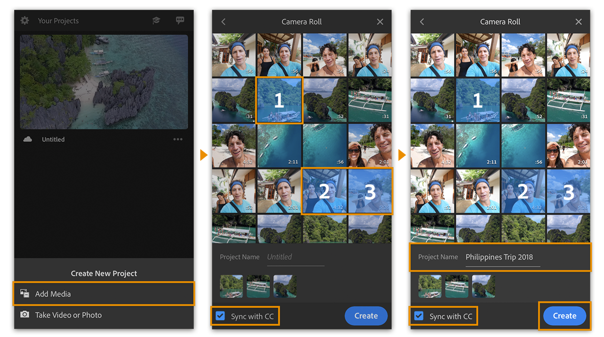 Em seguida, você pode escolher Adicionar mídia para usar mídias já capturadas no dispositivo, na Creative Cloud ou no Dropbox. Ou você pode tirar fotos ou gravar vídeos diretamente em um novo projeto, tocando em Capturar vídeo ou foto.