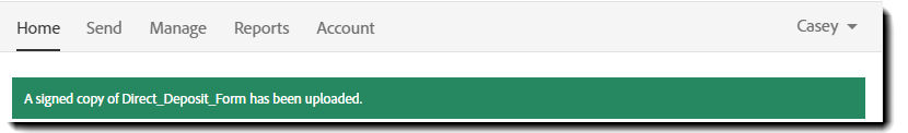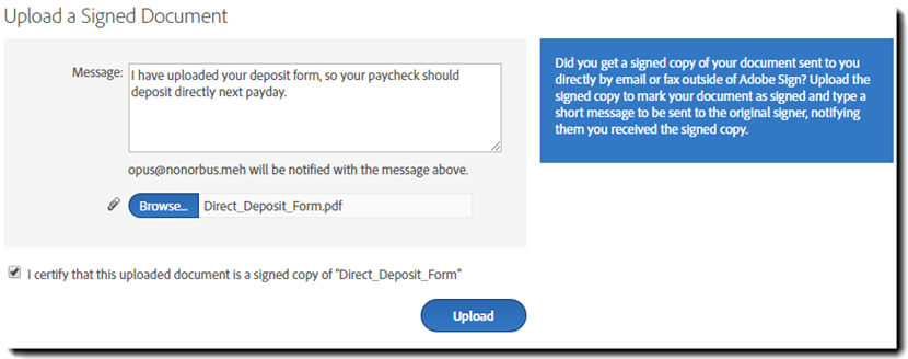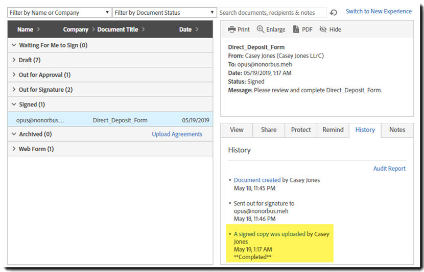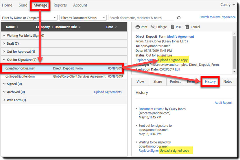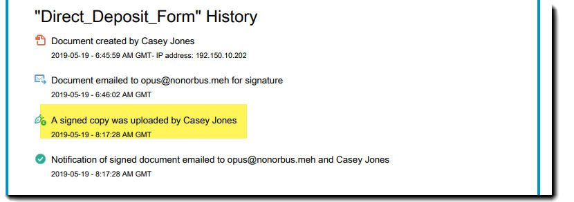 - Na lista de histórico, localize o destinatário que forneceu o documento assinado e clique no link Fazer upload de uma cópia assinada