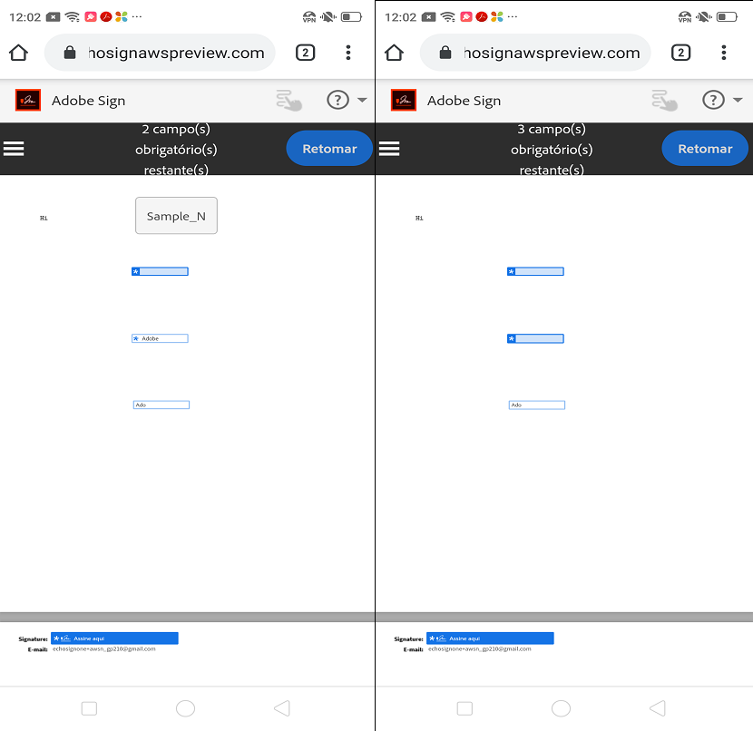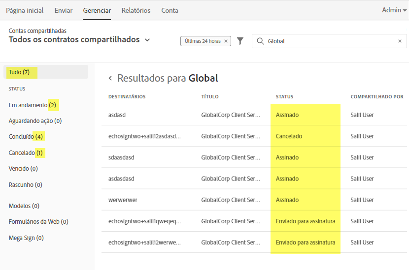 | 4551427 | Resumo: alguns destinatários, que já têm contas ativas e corretamente provisionadas, recebem contratos como destinatários “pseudousuário”, então o contrato não aparece na visualização normal de gerenciar. Isso acontece quando os endereços de email dos destinatários incluem espaços no início ou no final, o que impede o sistema de corresponder o email ao usuário existente e faz com que um registro de pseudousuário seja criado. |