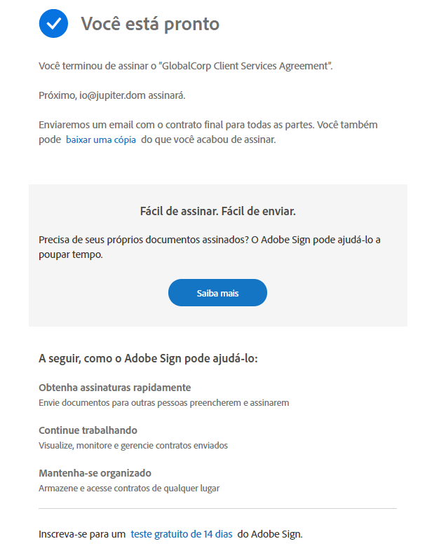 - Enviar notificações personalizadas por email com o conteúdo do contrato e o contrato assinado