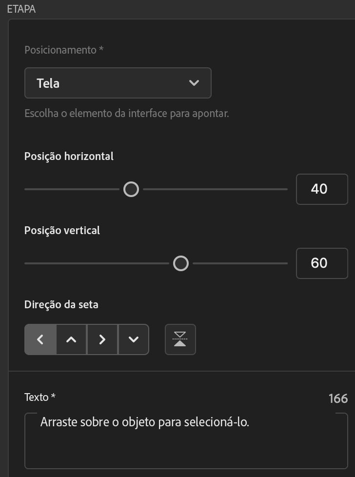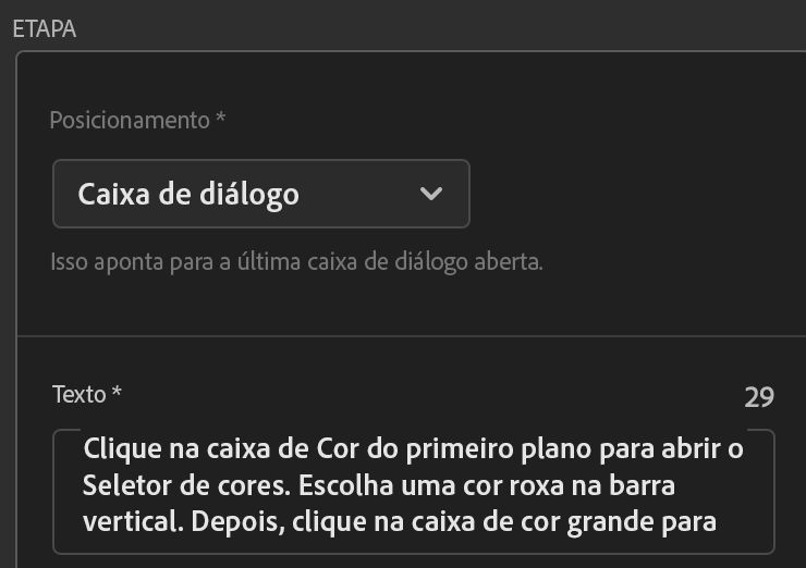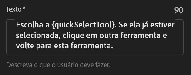 - Role para baixo até o campo Texto, onde há um texto gerado automaticamente para o coach mark sem ponto final.