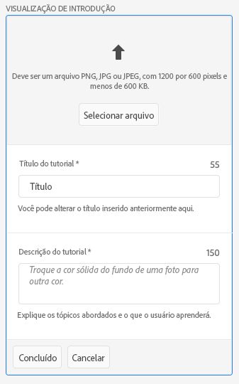 - Clique em Editar para acessar os campos de upload da imagem principal, edição do título do tutorial e adição de descrição do tutorial.
