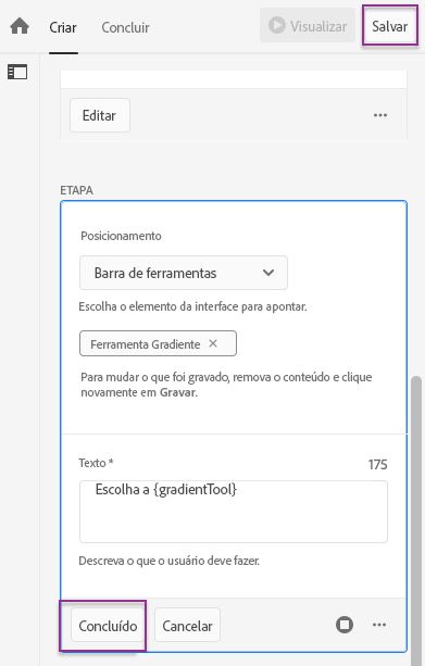 - Clique no botão Concluído abaixo dos detalhes de cada etapa e no botão Salvar no topo do Criador de Tutoriais.