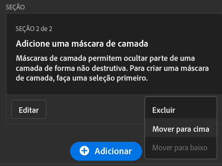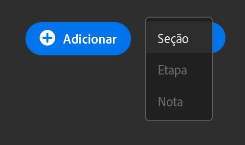 Dica importante: não é possível criar uma nova seção entre duas seções existentes ou logo após o cartão de introdução. - Uma alternativa é criar uma nova seção no final da pilha de seções e incluir pelo menos uma etapa nessa nova seção.