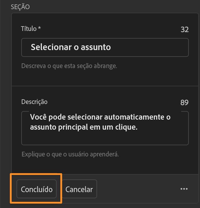 Crie seções e etapas para montar o tutorial. Busque criar um máximo de 4 (quatro) seções e um máximo de 5 (cinco) etapas em cada seção. Consulte o artigo Diretrizes de escrita do Criador de Tutoriais.