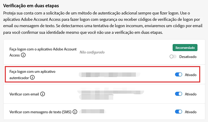 Você pode usar qualquer um dos seguintes métodos para ativar a verificação em duas etapas para sua conta de Adobe: