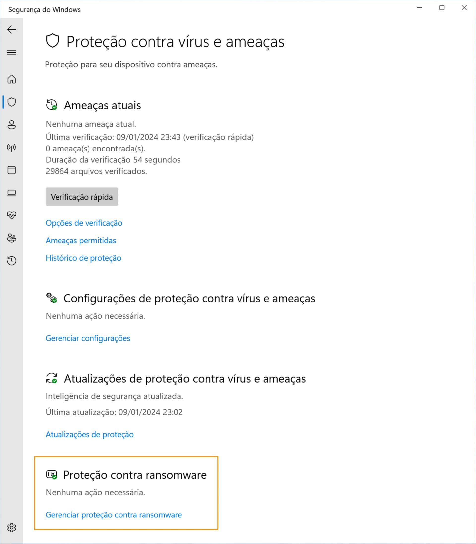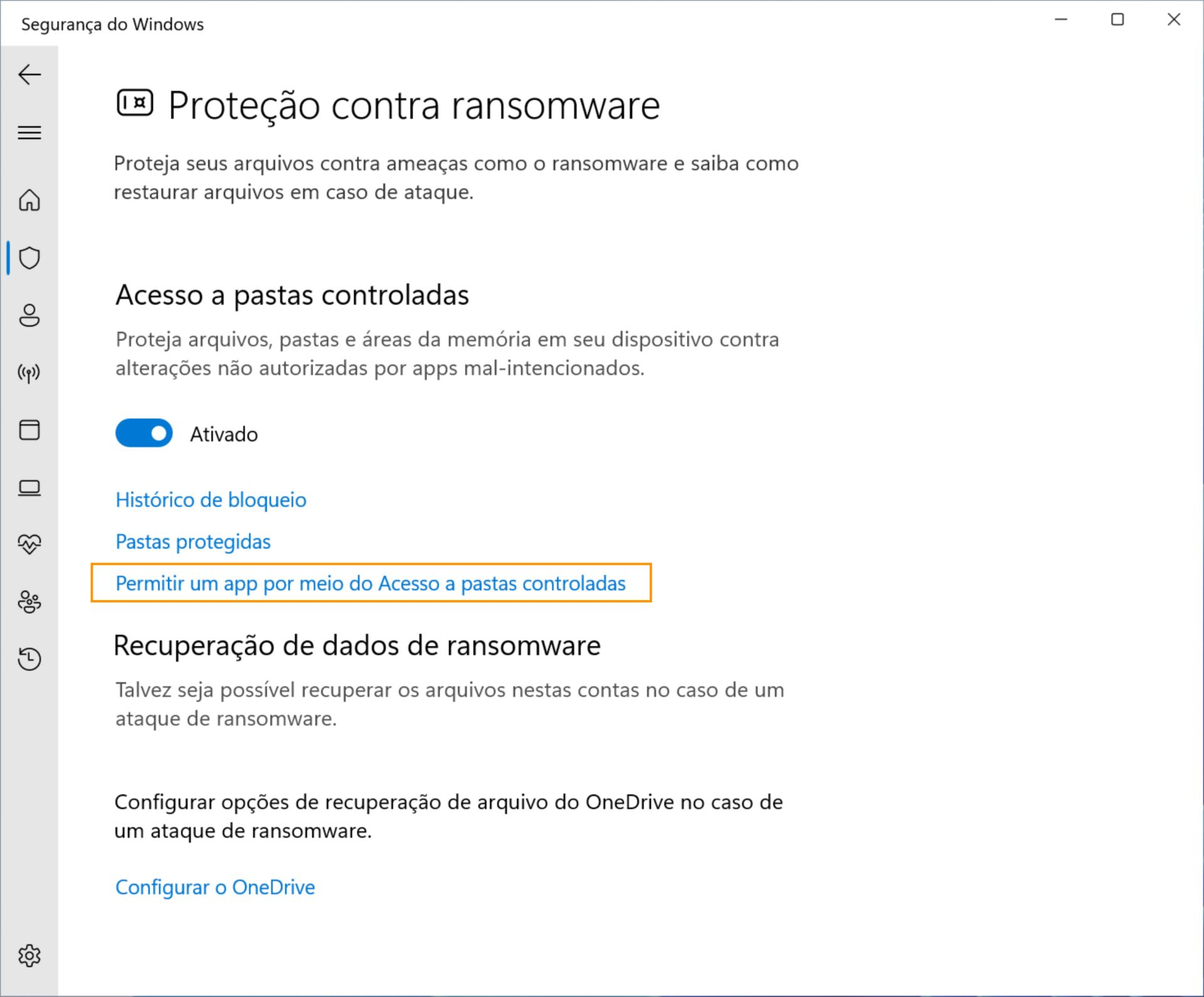Nas configurações de proteção contra vírus e ameaças, selecione Proteção contra ransomware.