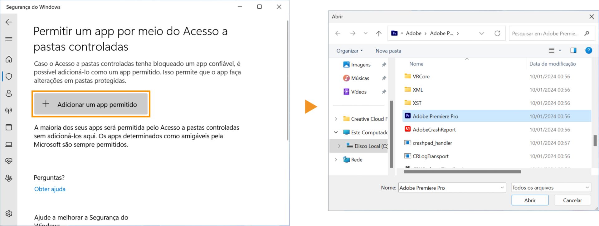 Para iniciar o Premiere Pro, o Adobe Media Encoder ou o After Effects quando o Acesso a pastas controladas estiver ativado, faça o seguinte: