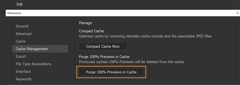 To delete 100% previews, go to Edit > Preferences > Cache Management > Purge 100% Previews in Cache.