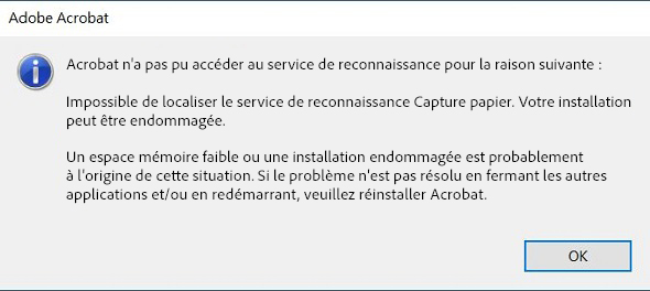 Lorsque vous tentez d’appliquer la reconnaissance optique des caractères (OCR) sur une page numérisée ou une image, Acrobat peut ne pas accéder au service OCR en raison d’un manque de mémoire système, de fichiers incomplets/corrompus, de formats non pris en charge, de logiciels obsolètes ou de ressources inadéquates. Acrobat affiche l’erreur suivante : « Acrobat n’a pas pu accéder au service de reconnaissance pour la raison suivante : impossible de localiser le service de reconnaissance Paper Capture. »