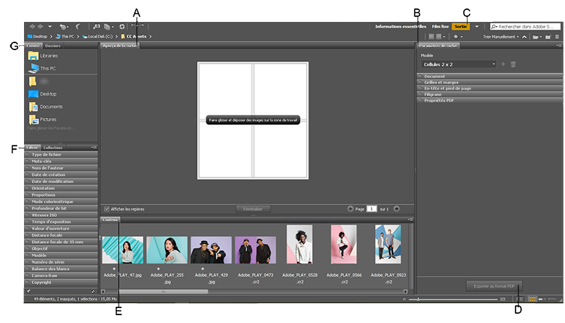 A. Panneau Aperçu de la sortie B. Panneau Paramètres de sortie C. Espace de travail Sortie D. Bouton Exporter au format PDF E. Panneau Contenu F. Panneaux Filtrer et Collection G. Panneaux Favoris et Dossiers