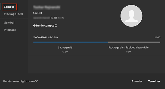 Préférences de compte dans Lightroom