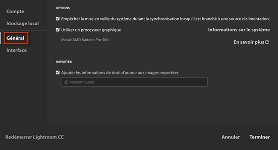 • Sélectionnez Redémarrer pour appliquer vos paramètres. Lightroom s’arrête et redémarre avec les paramètres mis à jour.