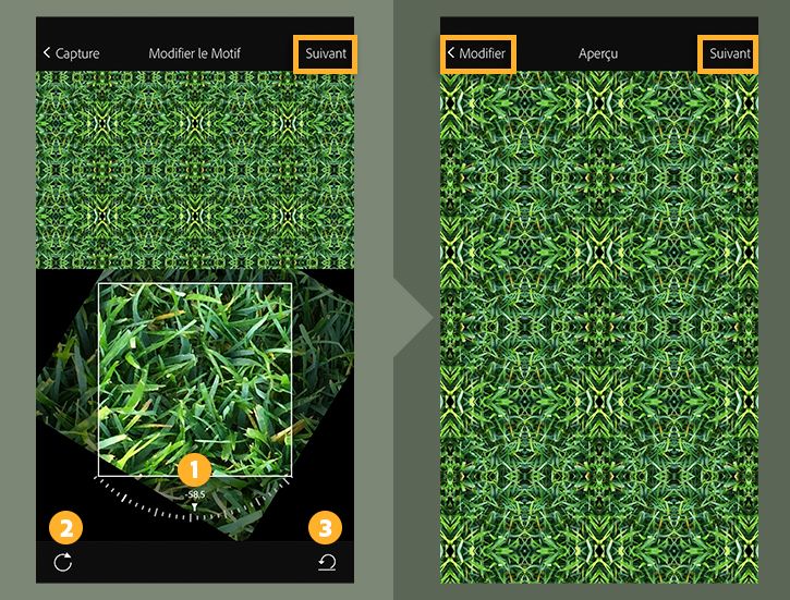Appuyez sur chacun des quatre styles de motif (1) et choisissez celui que vous préférez. Écartez deux doigts pour agrandir l'image et ajuster les détails du motif. Appuyez sur le bouton de capture (2) pour créer le motif sélectionné.