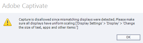 If you change the resolution of your operating system or the operating system text scaling, you may see issues where Captivate does not recognize the size of the application you are recording, and the Captivate recording area does not correctly reflect the application or the screen area that you want to record.