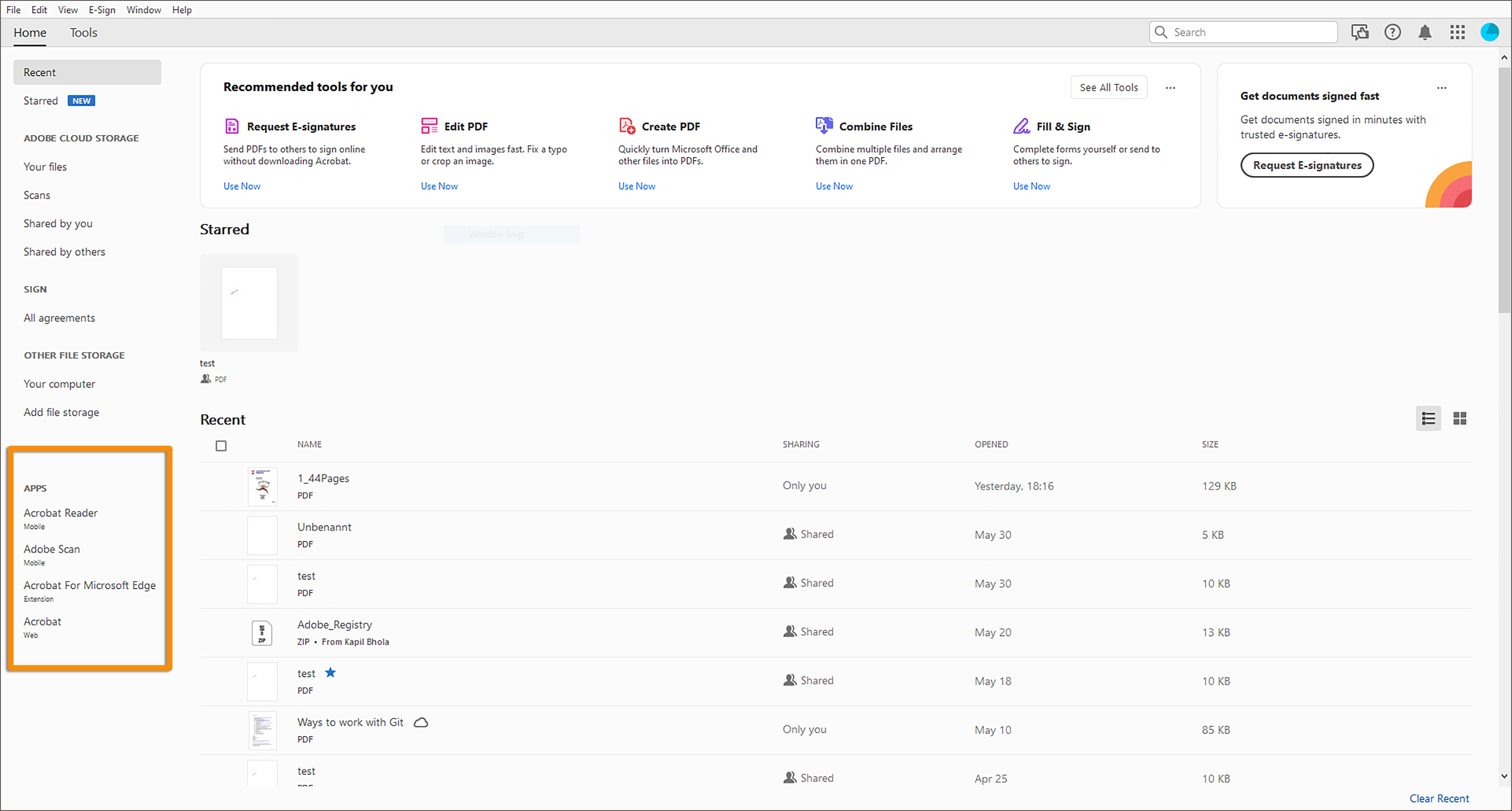 - Klicke auf der Startseite von Acrobat im linken Bereich auf die Acrobat Reader- oder Adobe Scan-App, die du installieren möchtest.