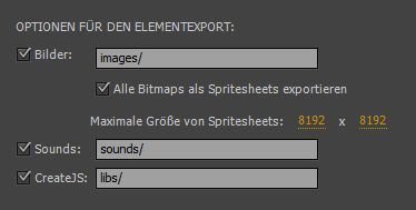 - Festlegen, dass Elemente nicht aus der FLA exportiert werden, indem die Element-Exportoptionen für Bilder, Sounds und unterstützende CreateJS-JavaScript-Bibliotheken deaktiviert und die relativen URLs für den Export verwendet werden.