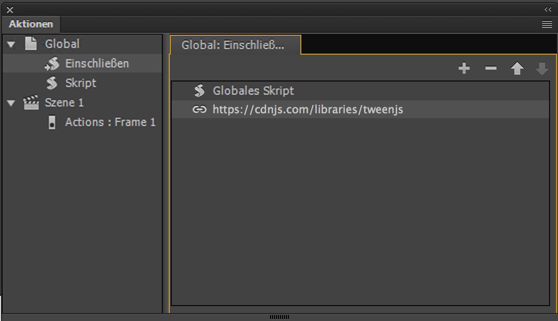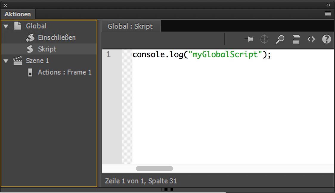 Animatoren nutzen häufig JavaScript-Code, der für die gesamte Animation gilt. Mit dieser Funktion können Sie nicht bildspezifische globale Skripts und Drittanbieterskripts hinzufügen, die Sie aus Animate auf die gesamte Animation anwenden können.