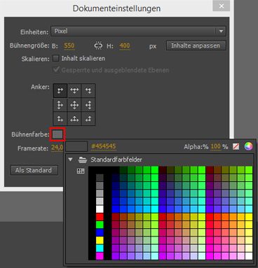 - Wählen Sie Modifizieren > Dokument > Bühnenfarbe oder wählen Sie im Eigenschafteninspektor die Option Erweiterte Einstellungen.