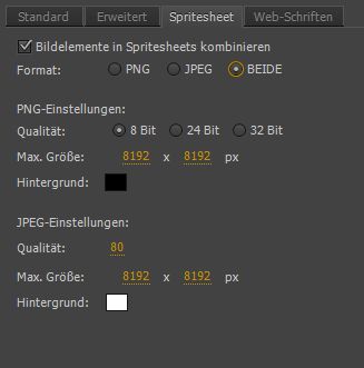 - Qualität: Wählen Sie die Spritesheet-Qualität „8 Bit“ (Standard), „24 Bit“ oder „32 Bit“.