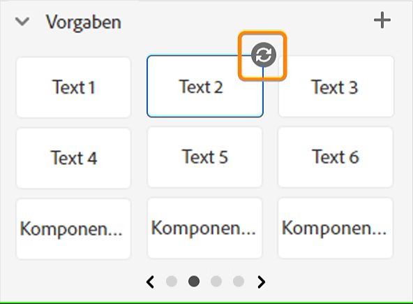 Wenden Sie im Abschnitt Erscheinungsbild eine Vorgabe an. Eine Vorgabe ist eine vorkonfigurierte Einstellung oder Vorlage, mit der Sie einen vordefinierten Satz von Stilen oder Effekten auf den ausgewählten Text anwenden können. Eine Vorgabe überschreiben Wenn Sie die Vorgabe ändern, z. B. Schriftart, Schriftgröße, die Schrift fett oder kursiv formatieren oder Sonstiges machen, können Sie die Vorgabe aktualisieren. Wählen Sie das Symbol Voreinstellung aktualisieren auf der Vorgabe, und die Vorgabe übernimmt die neuen Eigenschaften. Informationen zum Erstellen einer Vorgabe finden Sie im Abschnitt Erstellen einer Textvorgabe.