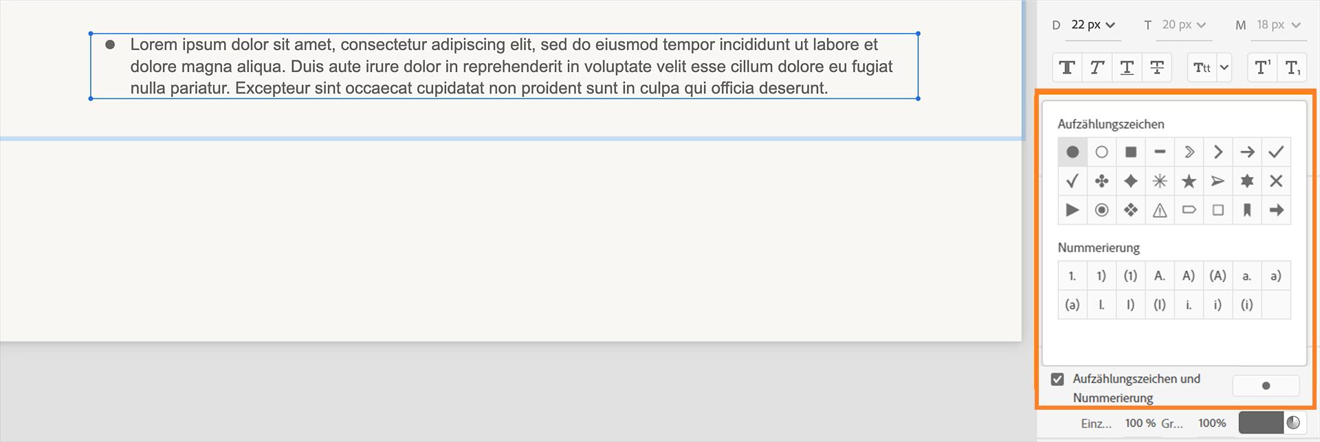 Wählen Sie Aufzählungszeichen und Nummerierung, um den ausgewählten Text in ein Format mit Aufzählungszeichen zu konvertieren. Sie können aus verschiedenen Aufzählungszeichen und Formaten für nummerierte Listen wählen.