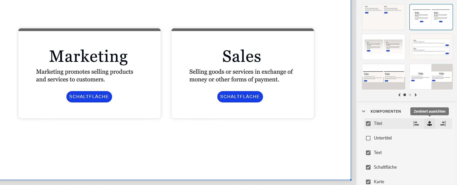 Ändern Sie die Ausrichtung von Titel, Untertitel, Haupttext oder Schaltfläche. Um die Ausrichtung zu ändern (links, zentriert oder rechts), bewegen Sie den Mauszeiger über den Titel und wählen Sie die gewünschte Ausrichtung aus.