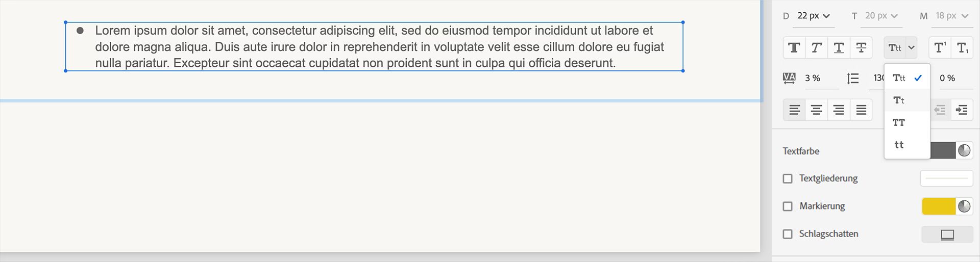 Wählen Sie ein beliebiges Textobjekt innerhalb des Textinhaltsblocks aus. Im Bedienfeld Visuelle Eigenschaften werden alle Eigenschaften angezeigt, die Sie auf den Text anwenden können. Textformatierungsoptionen Textformatierungsoptionen