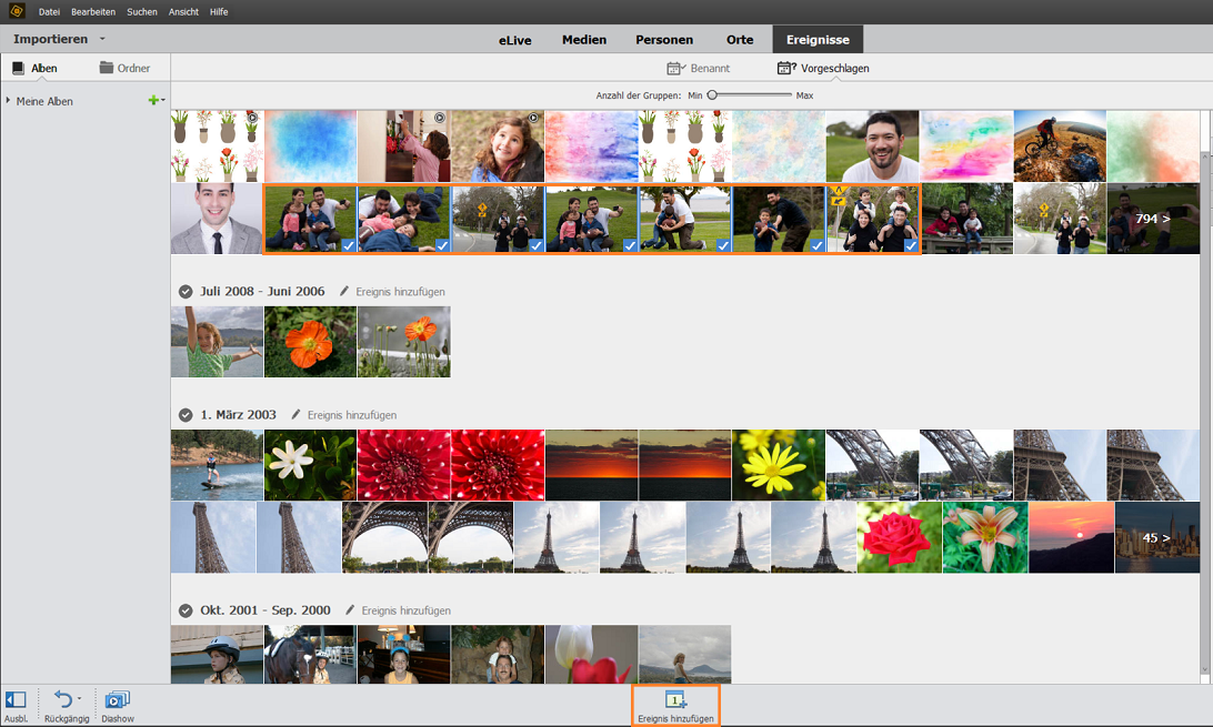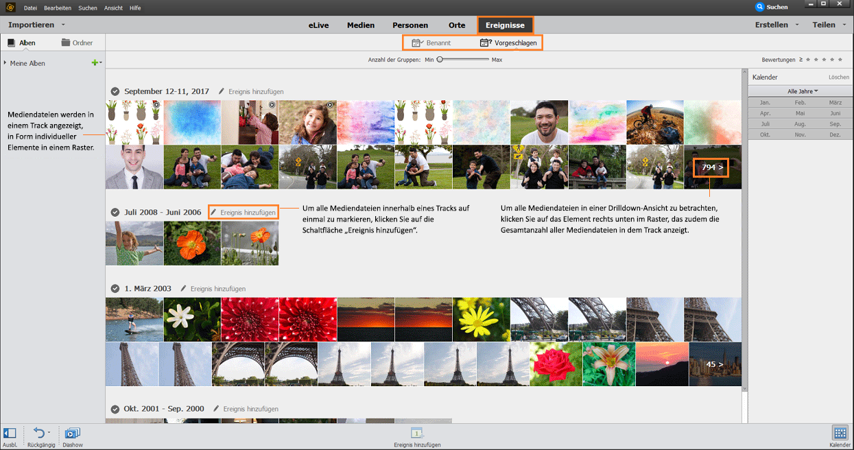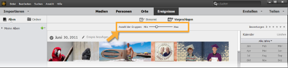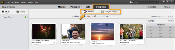 Häufig empfiehlt es sich, dass Sie Fotos oder Videodateien nach den zugehörigen Ereignissen gruppieren, etwa einer Hochzeit oder einem Geburtstag. Elements Organizer bietet zwei Möglichkeiten, wie Sie Mediendateien nach Ereignissen ordnen können: