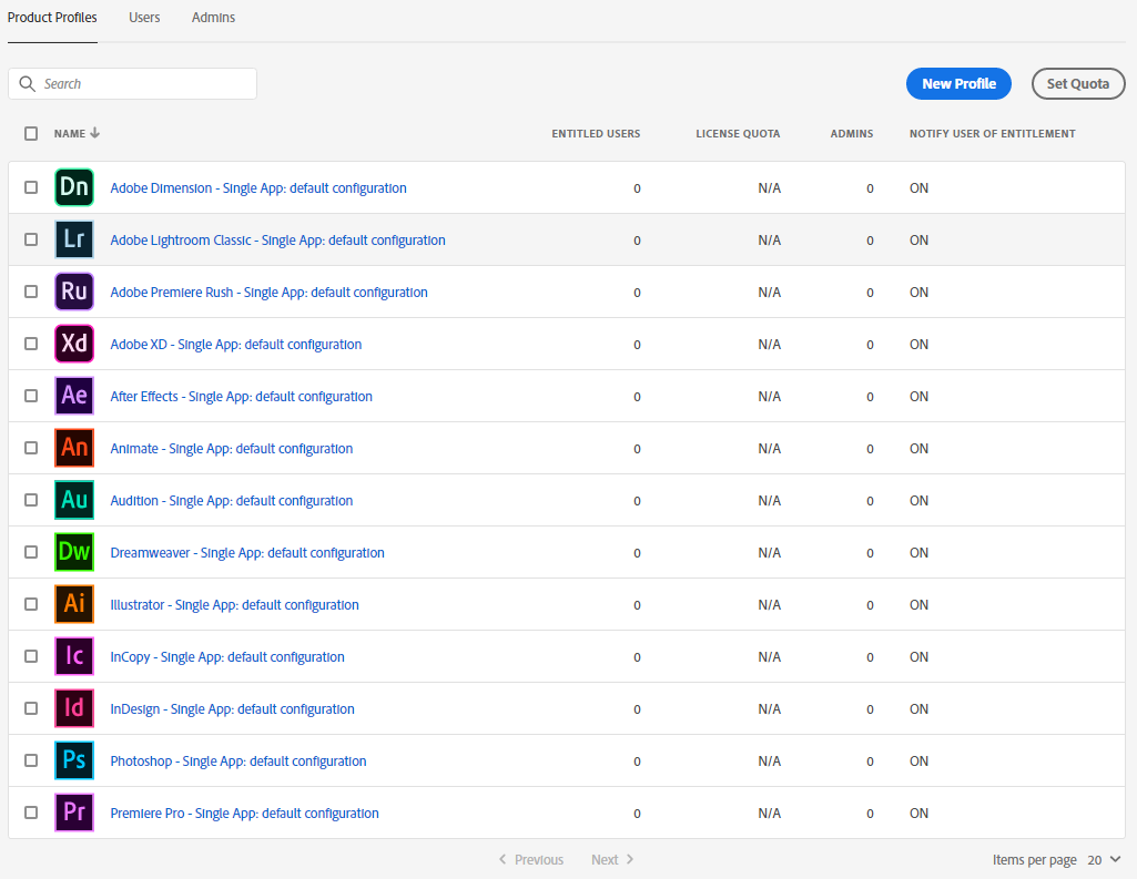 Das Standardkontingent wird für alle Produktprofile auf null gesetzt. Passen Sie die Kontingentzuordnungen an die Anforderungen Ihrer Organisation an. Führen Sie die Verfahren weiter unten aus, um Produktprofilen ein Kontingent und Benutzer zuzuweisen.