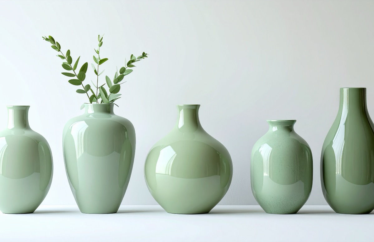 Verwendeter Prompt: Minimalistische, matte, moderne grüne Vasen in verschiedenen Formen, aufgereiht vor einem weißen Hintergrund.