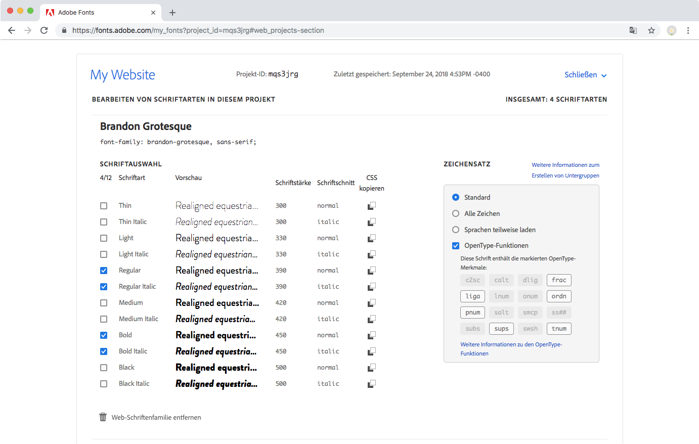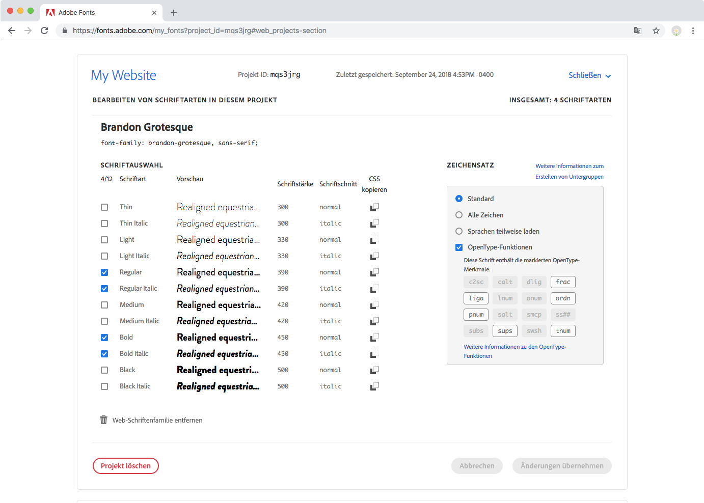 - Verwenden Sie die Kontrollkästchen, um die Schriftstärken und -schnitte auszuwählen, die Sie verwenden möchten.