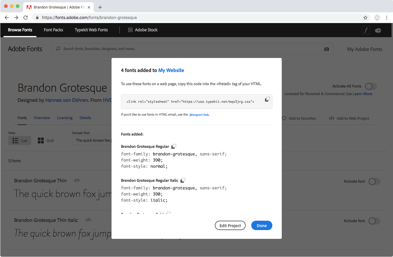Auf der Seite zum Web-Projekt werden der Name der CSS-Schriftfamile, die numerische Stärke und der Schriftschnitt zu jeder Schrift innerhalb des Projekts aufgeführt. Verwenden Sie diese Schriftfamiliennamen im CSS, um die Schriften auf den Text anzuwenden.