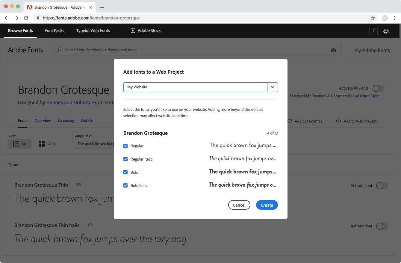 Im Fenster „Schriften zu einem Webprojekt hinzufügen“ geben Sie Ihr Web-Projekt an und wählen aus, welche Schriften verwendet werden sollen.