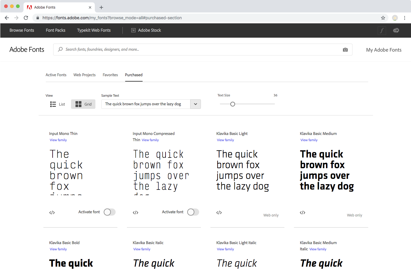 Schriften, die Sie von einem Herstellerpartner erworben haben, sind auf der Registerkarte „Gekauft“ aufgeführt.
