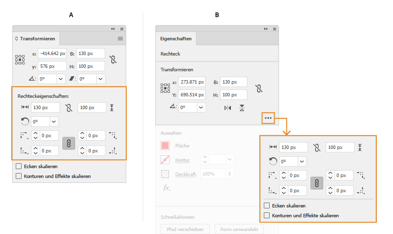 - Eckradien: Verwenden Sie für jede der Ecken des Rechtecks die Schrittsteuerung oder geben Sie einen absoluten Wert im Transformierenbedienfeld ein.